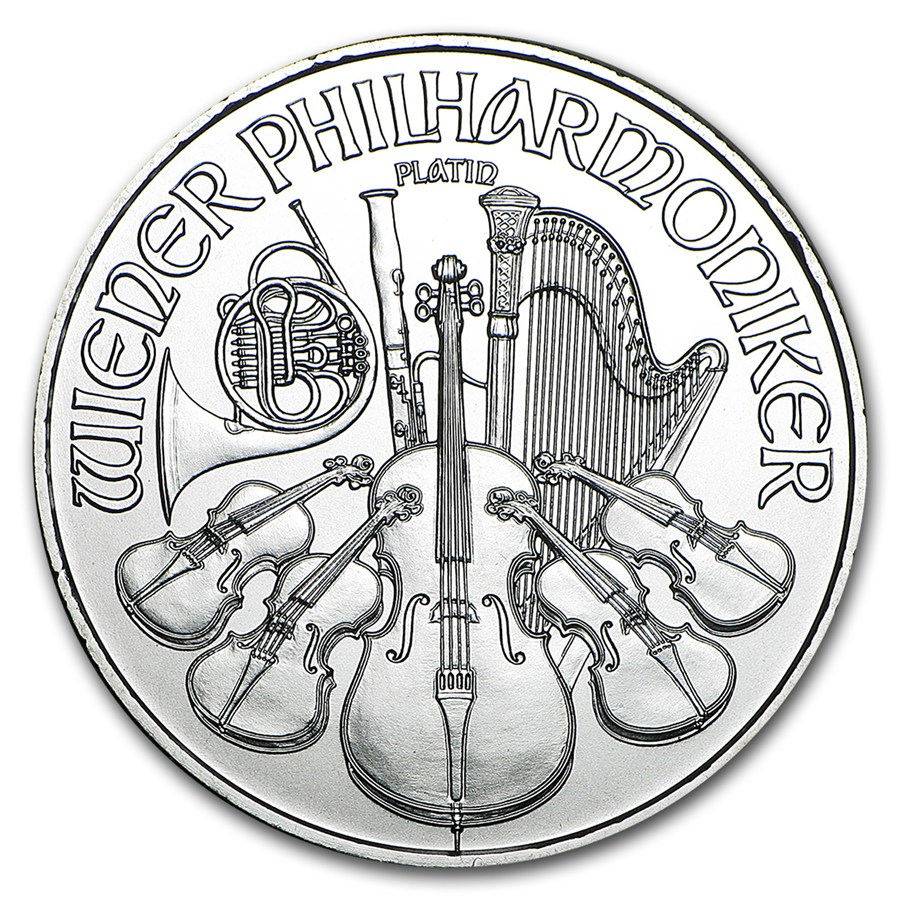 На реверсе платиновой монеты австрийский Филармоникер изображены различные музыкальные инструменты, такие как контрабас, виолончели, скрипки, фагот, арфа и труба. Сверху надпись – WIENER PHILHARMONIKER.