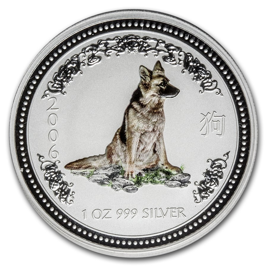 Цветное изображение немецкой овчарки — символа 2006 года по Лунному календарю. Справа от собаки изображен иероглиф, обозначающий собаку. Слева — год выпуска. Снизу вес и чистота металла.