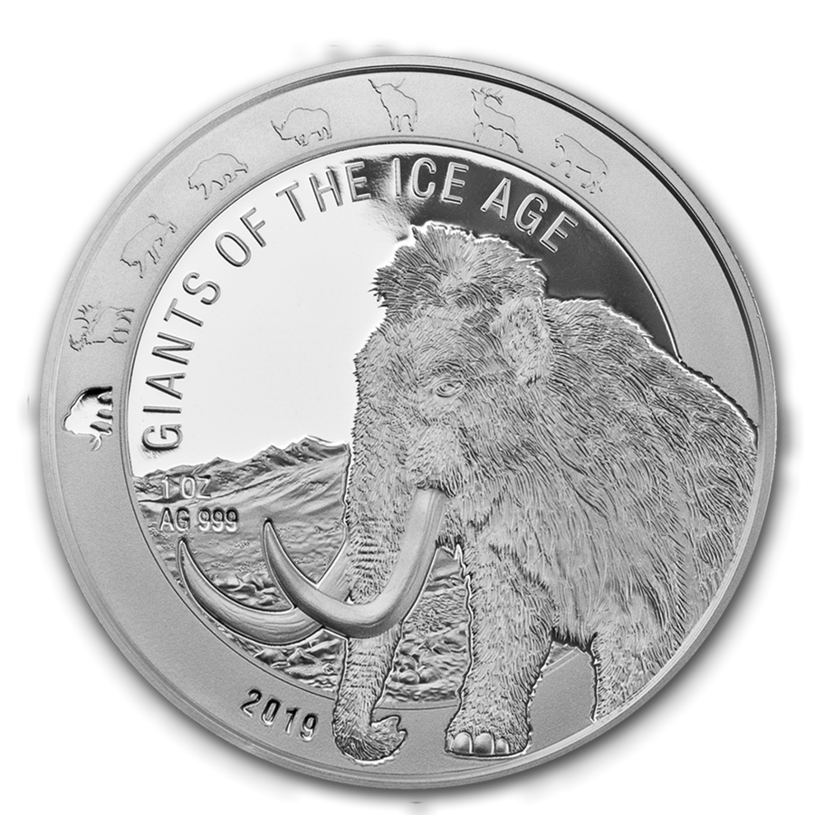 Изображение шерстистого мамонта. Название серии — «GIANTS OF ICE AGE». Снизу от названия указаны вес и чистота металла. По ободу очертания животных, входящих в данную серию и год выпуска монеты.