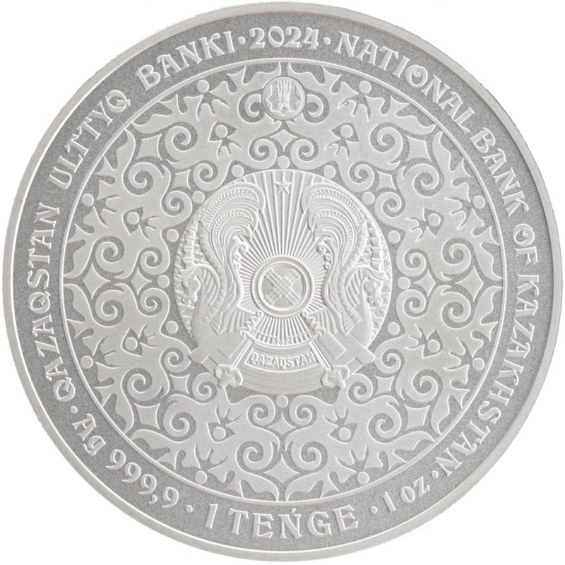 На аверсе на фоне национального орнамента изображен  герб Казахстана. Над гербом монограмма Казахстанского монетного двора. Вдоль канта надпись: QAZAQSTAN ULTTYQ BANKI • 2024 • NATIONAL BANK OF KAZAKHSTAN • Ag 999,9 • 1 TEŃGE • 1oz • (Национальный банк Казахстана, год чеканки, вес и проба серебра, номинал).