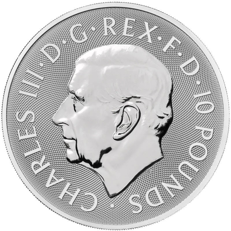 На аверсе изображен Его величество Король Чарльз III. Внизу портрета инициалы дизайнера MJ (Martin Jennings). Вдоль канта надпись: CHARLES III · D · G · REX · F · D · 10 POUNDS · 2025 · (Чарльз III, божьей милостью, король, защитник веры, номинал, год чеканки).