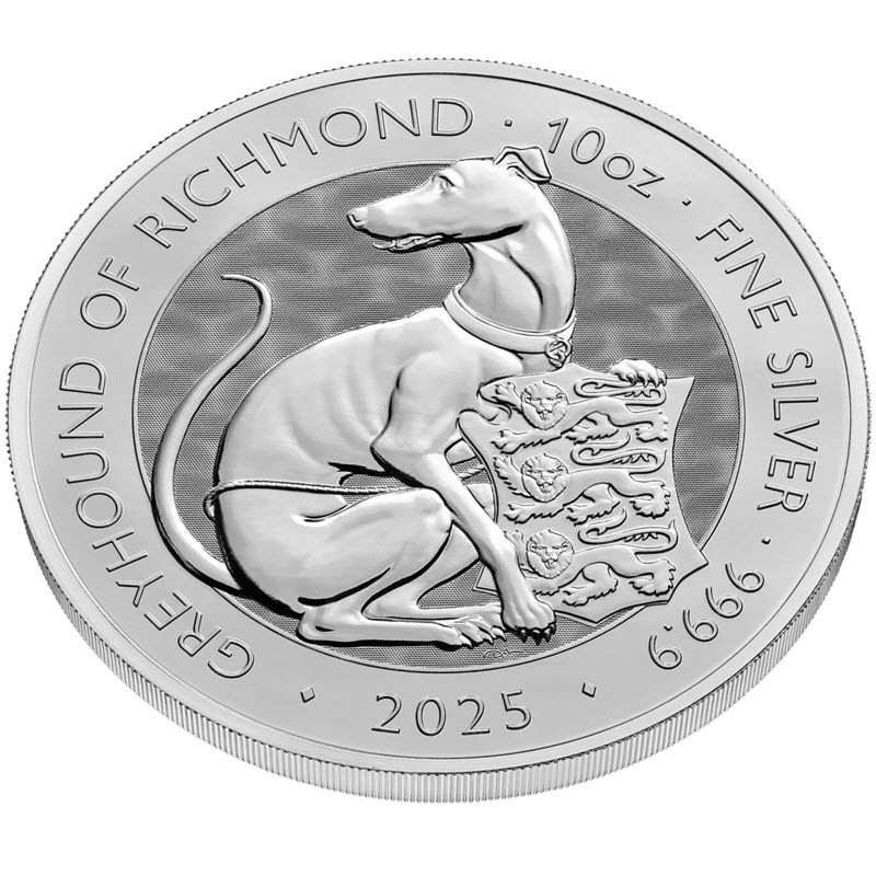 На реверсе изображена сидящая борзая, положившая лапу на щит с тремя львами Англии. У щита в верхнем углу выемка, куда упиралось копьё для атаки в рыцарских турнирах. Вдоль канта надпись: GREYHOUND OF RICHMOND · 10 OZ · FINE SILVER · 999.9 · 2025 · (Грейхаунд Ричмонда, вес и проба серебра, год чеканки). Внизу над датой инициалы дизайнера D.L (David Lawrence).