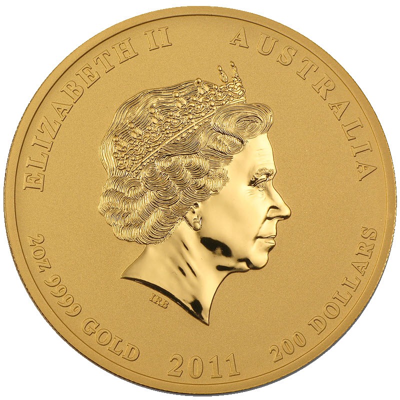 На аверсе изображена Ее Величество королева Елизавета II в бриллиантовой тиаре. Под портретом королевы инициалы дизайнера IRB (Ian Rank Broadley). Вдоль канта надпись: ELIZABETH II AUSTRALIA 2oz 9999 GOLD 2011 200 DOLLARS (Елизавета II, страна-эмитент, вес и проба золота, год чеканки, номинал).