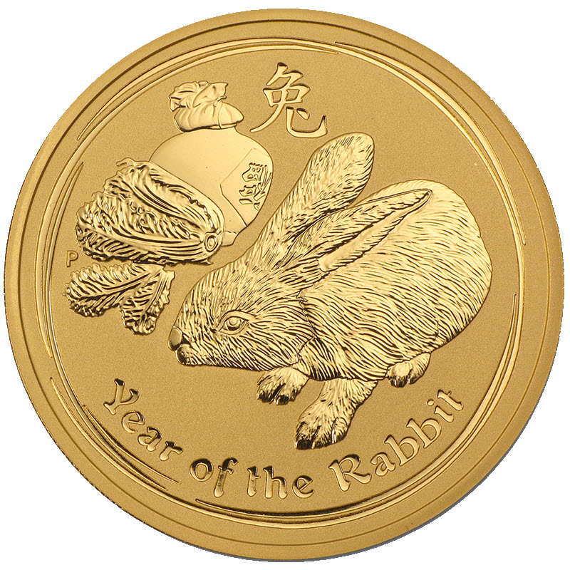 На реверсе изображен кролик рядом с капустой и горшком. Вверху китайский иероглиф: 兔 (Кролик), слева монограмма Пертского монетного двора Р,  внизу: Year of the Rabbit.