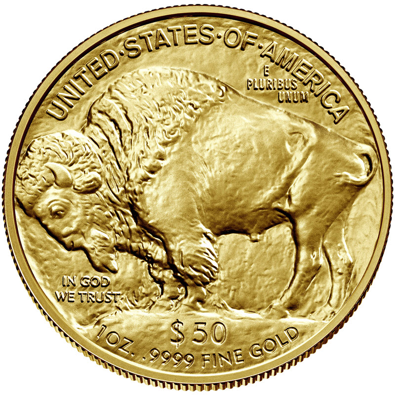 На реверсе золотой монеты помещено изображение бизона, сверху надписи: UNITED STATES OF AMERICA - Соединённые Штаты Америки, E PLURIBUS UNUM - Из многих - единое. Внизу надписи: IN GOD WE TRUST - В бога веруем, 1 oz. 0.9999 FINE GOLD — чистое золото 999,9 пробы и номинал монеты - $ 50.