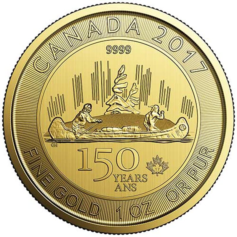 На реверсе монеты изображены вояжеры (один – европеец, другой – коренной житель) на каноэ. Под ними указано обозначение юбилея в три строки: «150 YEARS ANS» (150 лет). Справа тайный знак в форме кленового листа, внутри которого находится еще меньший кленовый лист, а в центре него расположена цифра – «17». Над каноэ указана проба металла – «9999». По ободу в центре находятся следующие надписи: сверху - «CANADA 2017» (Канада 2017), снизу – «FINE GOLD 1 OZ OR PUR» («чистое золото» на англ. и фр. языках, 1 унция). Поверхность вдоль обода выполнена в форме радиальных лучей.