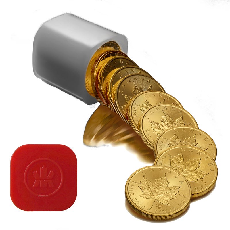 Оригинальная туба от Королевского монетного двора Канады Gold Maple Leaf вмещает 10 монет.