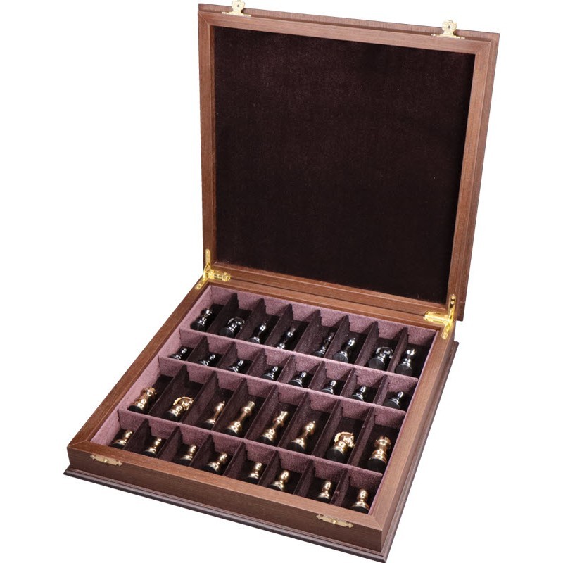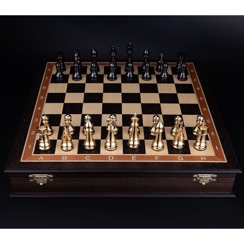 Шахматная доска служит ларцом для фигур, внутри которого нежнейший ложемент из бархата с отдельными секторами под каждую фигурку. Доска закрывается на замки ручной работы.