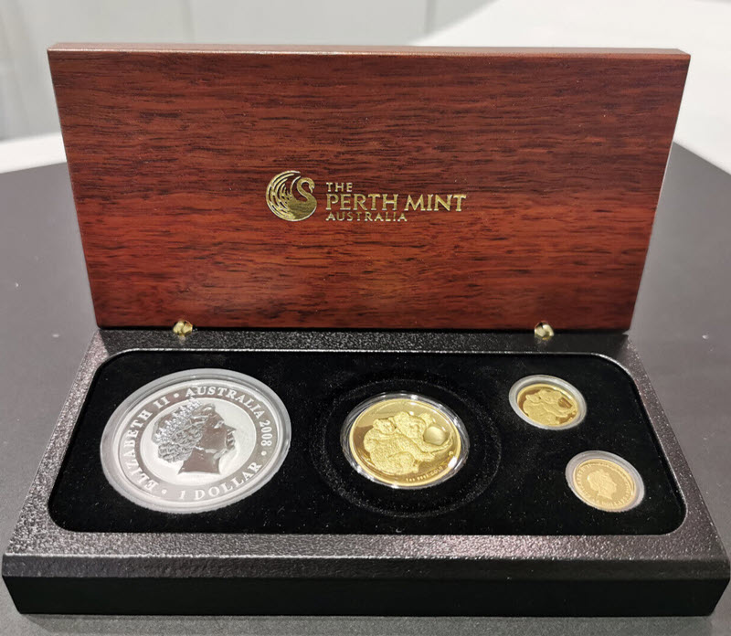 Набор «Коала» 2008 г состоит из золотых монет: 1 oz, 1/10 oz, 1/25 oz с номиналом: 100, 15, 5 долларов и одной серебряной монеты - 1 oz с номиналом 1 доллар.