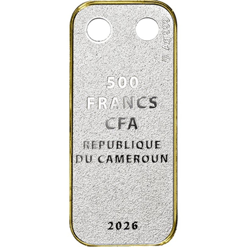 На аверсе справа вверху надпись: mw Ag 999 (монограмма польского монетного двора, проба серебра).  Ниже надпись: 500 FRANCS CFA REPUBLIQUE DU CAMEROUN 2026 (номинал, страна-эмитент, год чеканки).
