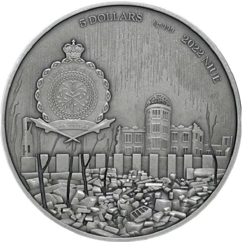 На аверсе монеты изображен разрушенный город. На аверсе также изображен герб Ниуэ и надписи: «2022» — год выпуска, «NIUE» — страна выпуска, «5 DOLLARS» — номинал и «Ag 999» — проба монеты. Серебро.