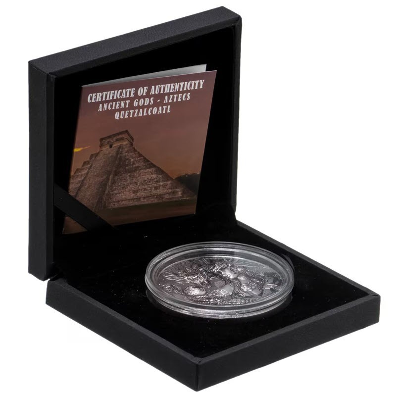 Эта великолепная серебряная монета весом в 3 унции – первая из серии «Древние Боги» - посвящена Кетцалькоатлю. У нее античная отделка и высокий рельеф с использованием технологии Smartminting. Поставляется в оригинальном футляре с сертификатом подлинности. Тираж: 333 штук.