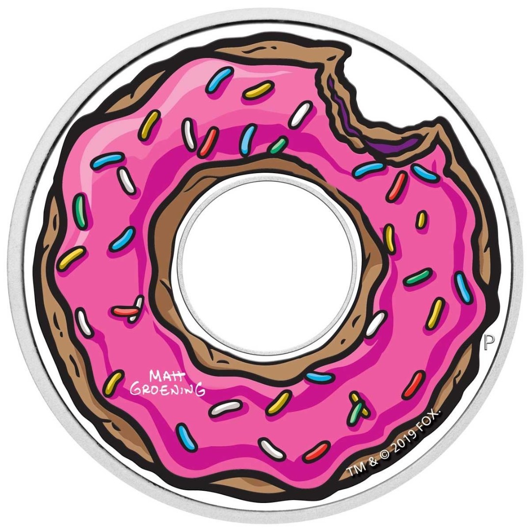 На реверсе монеты имеется штамп с центром для настоящего дизайна пончика. На реверсе монеты изображен культовый пончик с розовой глазурью от Гомера с брызгами и укусом в правом верхнем углу. Дизайн также включает в себя подпись Мэтта Грёнинга и знак P P монетного двора Perth Mint.