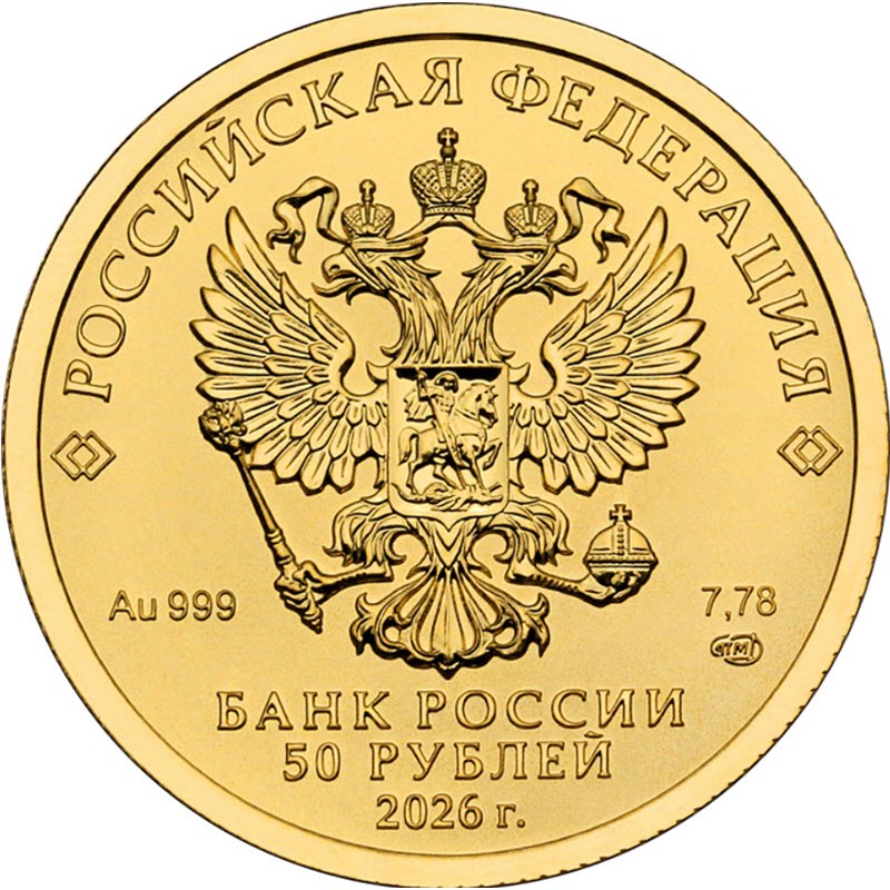 На аверсе в центре — рельефное изображение Государственного герба Российской Федерации, вверху вдоль канта надпись: РОССИЙСКАЯ ФЕДЕРАЦИЯ, обрамленная с обеих сторон сдвоенными ромбами, под гербом надпись: Au 999 7,78 ..МД (вес и проба золота, монограмма монетного двора), внизу надпись в три строки: БАНК РОССИИ 50 РУБЛЕЙ 2026 г. (банк, номинал, год чеканки).