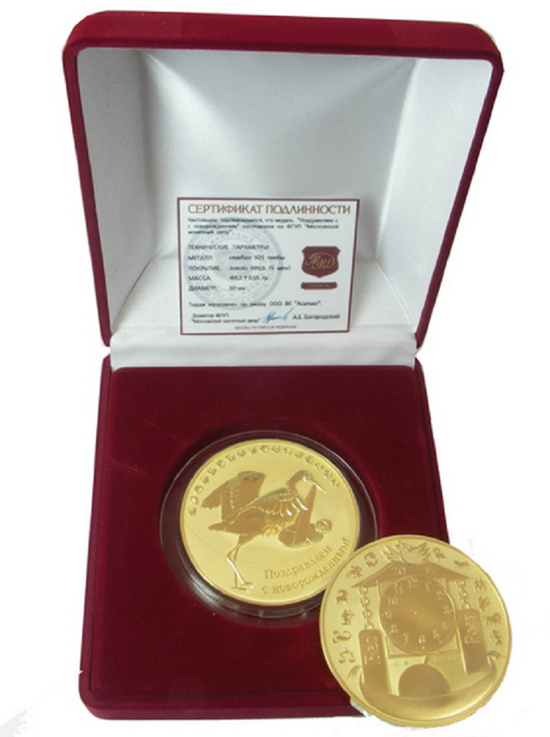Серебряная медаль с позолотой, выпущенная Московским монетным двором. Необычный,оригинальный и эксклюзивный подарок,который навсегда оставит в памяти воспоминания о рождении ребенка.На обороте медали гравируются метрические данные:Имя,дата и время рождения,вес,рост.