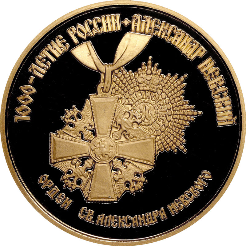 Изображения звезды и знака на ленте ордена Св. Александра Невского, по окружности надписи: вверху - "1000-ЛЕТИЕ РОССИИ * АЛЕКСАНДР НЕВСКИЙ", внизу - "ОРДЕН СВ. АЛЕКСАНДРА НЕВСКОГО".