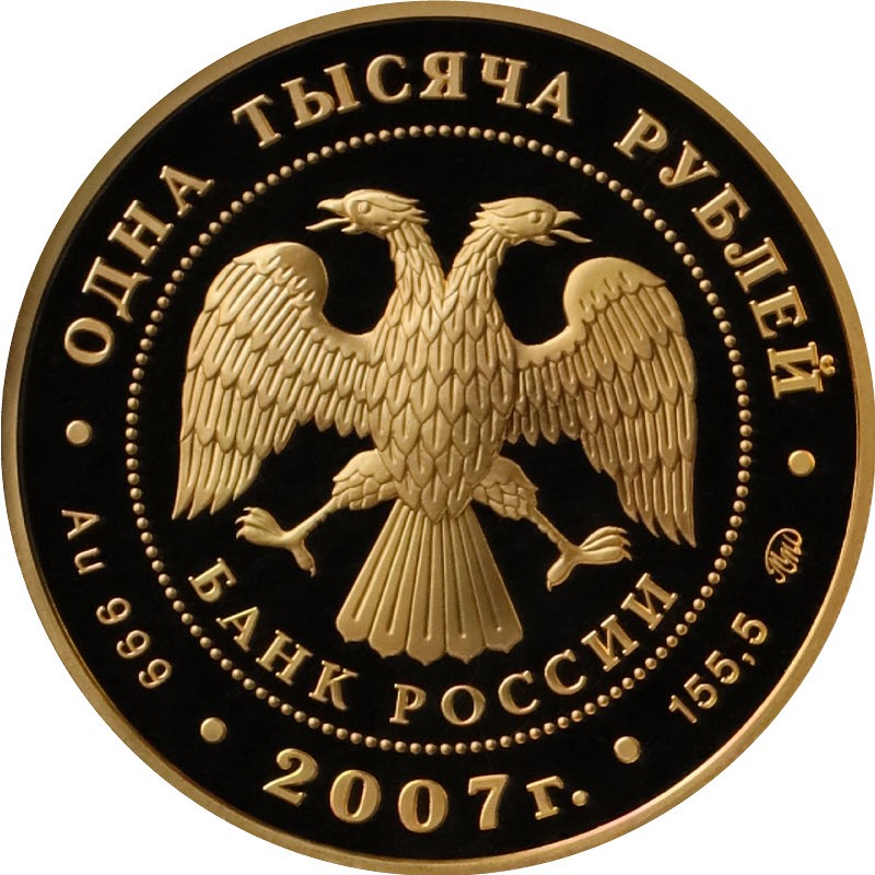В центре – эмблема Банка России (двуглавый орёл с опущенными крыльями, под ним – надпись полукругом «БАНК РОССИИ»), обрамленная кругом из точек и надписями по кругу – вверху: «ОДНА ТЫСЯЧА РУБЛЕЙ», внизу: слева – обозначения драгоценного металла и пробы сплава, в центре – дата выпуска «2007 г.», справа – одержание химически чистого металла и товарный знак монетного двора.
