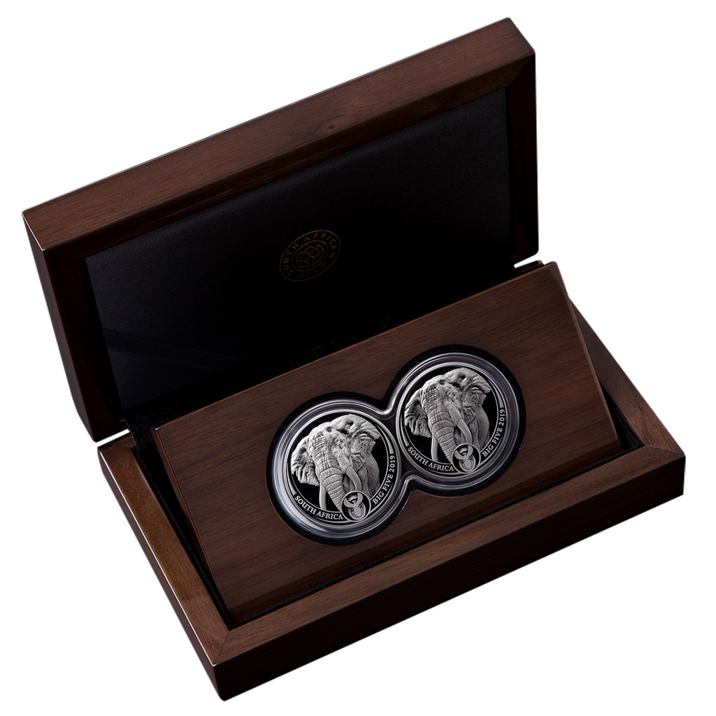 Крупное изображение слона, снизу герб ЮАР, название страны — "South Africa" и название серии — "Big Five 2019"