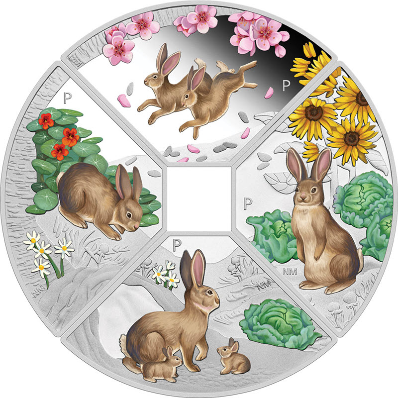 Этот набор посвящен году кролика и состоит из четырех серебряных монет весом в 1 унцию, каждая из которых представляет собой четверть круга. Сложенные вместе, монеты образуют квадрат в центре. Монеты выполнены в цвете, имеют качество Proof и поставляются в красивом футляре.