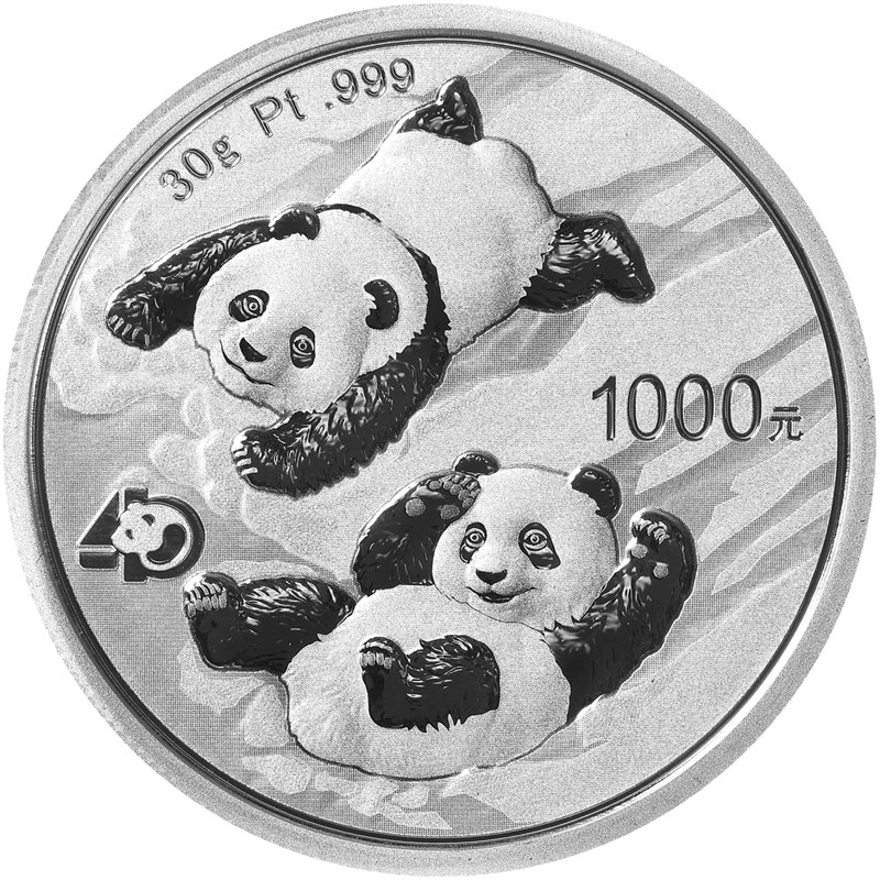 На реверсе изображены два детеныша панды, играющие на снегу. Слева вверху надпись: 30g Pt.999 (вес и проба платины), справа: 1000 元 (номинал). Слева метка: 40 (40-я годовщина выпуска «Панды» 1982-2022 гг).