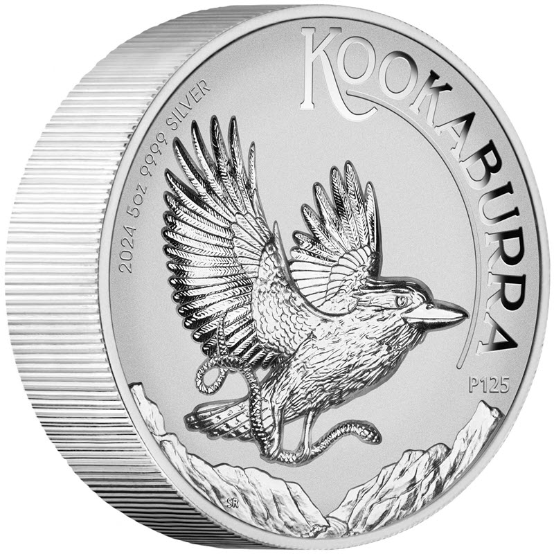 На реверсе изображена кукабарра в полете со змеей в когтя. Слева внизу инициалы дизайнера SR (Sean Rogers). Слева вверху надпись: 2024 5oz 9999 SILVER (год чеканки, вес и проба серебра). Справа: KOOKABURRA, ниже: Р125 (125-летие Пертского монетного двора).