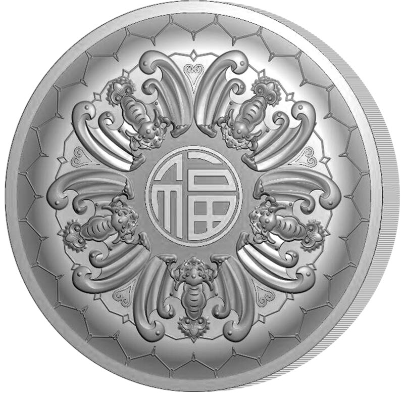 На реверсе в центре изображен китайский иероглиф 福 (счастье, удача). Вокруг него стилизованное изображение пяти летучих мышей, символизирующих пять видов счастья или благ – здоровье, долголетие, богатство и удача, добродетельная жизнь.