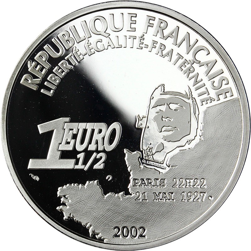 В центре - профиль Чарльза Линдберга в летном шлеме и очках на фоне карты части Атлантического океана и побережья. Под ним указано имя летчика - C. LINDBERGH (Чарльз Линдберг). Рядом - крупная надпись: 1 EURO ½ (номинал) и монограмма Парижского монетного двора (рог изобилия) и личное клеймо гравера. Справа указаны время и дата прибытия в Париж — PARIS 22H22 21 MAI 1927. Вверху надпись в две строки: RÉPUBLIQUE FRANÇAISE LIBERTÉ ÉGALITÉ FRATERNITÉ (страна эмитент, девиз Франции). Внизу – 2002 год чеканки.