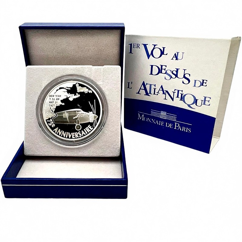 Эта чудесная серебряная монета Парижского монетного двора Франции посвящена 75-летию первого беспосадочного трансатлантического перелета, совершенного Чарльзом Линдбергом в 1927 году.