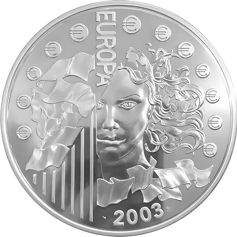 Эта чудесная серебряная монета Парижского монетного двора из серии «Европа» весом 1000 г чистого серебра 925 пробы в честь первой годовщины введения евро.