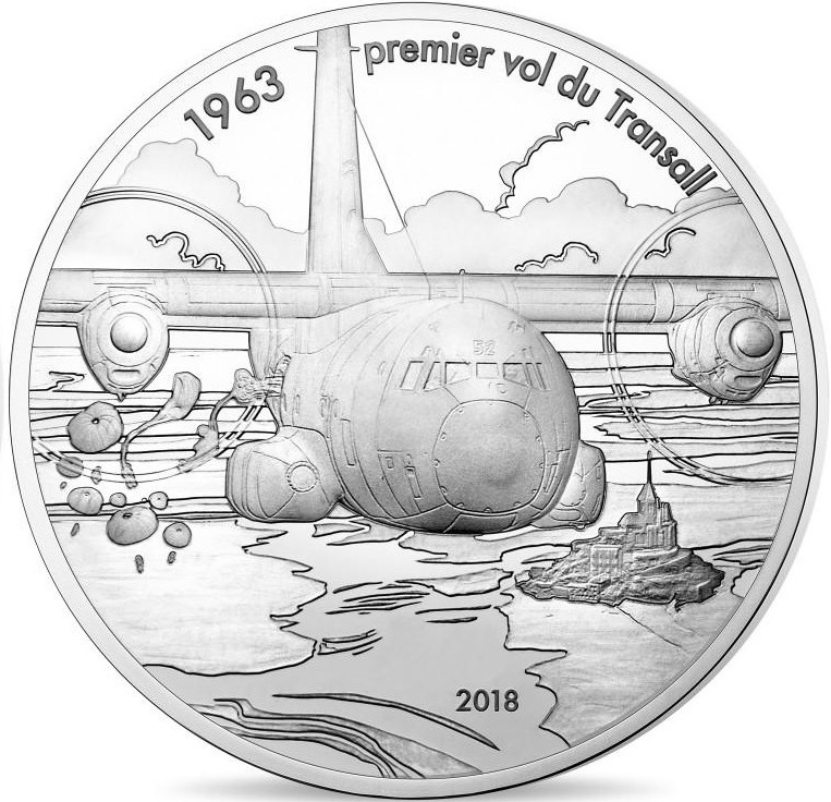 Серебряная монета, выпущена монетным двором Парижа, посвящена 50-летию первого полета самолета «Трансал».