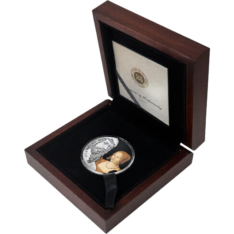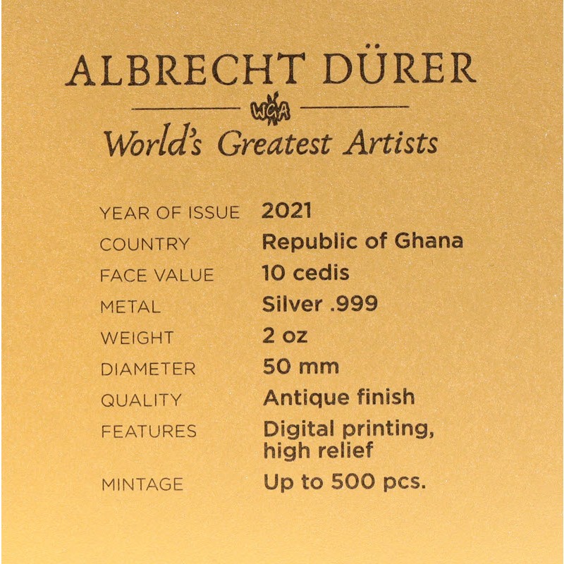 Эта красивая серебряная монета весом в 2 унции — монета из серии «Величайшие художники мира», посвященная художникам, изменившим представление о красоте и гармонии. В этом выпуске — Альбрехт Дюрер. На монете изображен профиль художника с высоким рельефом. У монеты качество античной отделки, она поставляется в футляре вместе с сертификатом подлинности. Ограниченный тираж - всего 500 штук по всему миру.