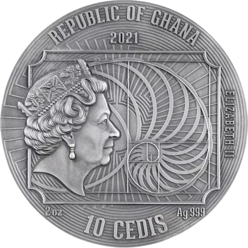 На аверсе монеты изображен портрет Ее Величества Королевы Елизаветы II дизайнера Яна Рэнка-Бродли и надписи: REPUBLIC OF GHANA ELIZABETH II 10 CEDIS 2 oz Ag 999 (страна-эмитент, Елизавета II, номинал, вес и проба серебра).