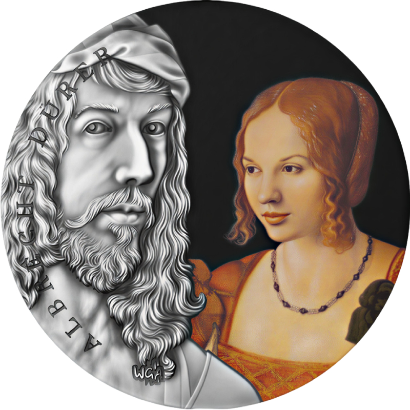 На реверсе монеты изображен портрет Альбрехта Дюрера на фоне его картины «Портрет молодой венецианской женщины». Слева надпись: ALBRECHT DURER и аббревиатура WGA (World's Greatest Artists — Величайшие художники мира).