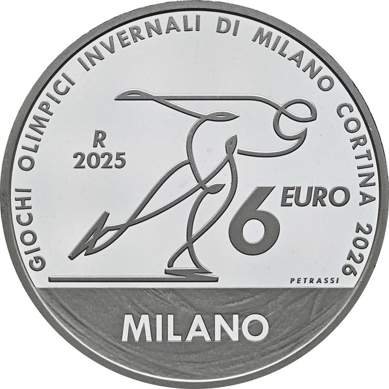 На реверсе изображена пиктограмма конькобежного спорта. Слева от пиктограммы надпись: R 2025(монограмма римского монетного двора, год чеканки), справа: 6 EURO PETRASSI (номинал, инициалы дизайнера Silvia Petrassi), внизу: MILANO (место проведения соревнований). Вдоль канта надпись: GIOCHI OLIMPICI INVERNALI DI MILANO CORTINA 2026 (игры).