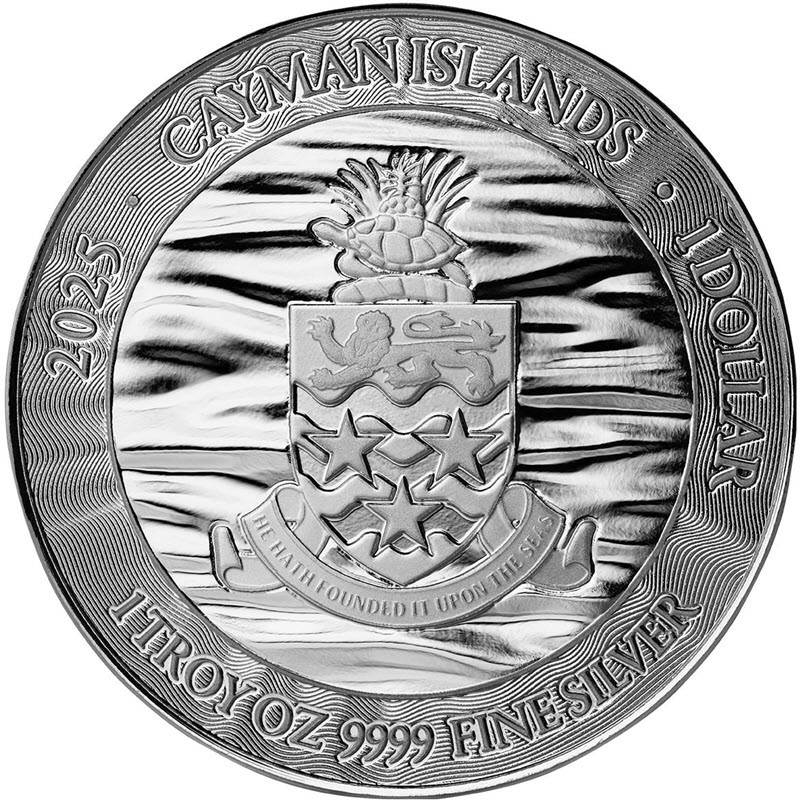 На аверсе изображен герб Каймановых островов, состоящий из щита, шлема с гребнем и девиза. Три звезды, символизирующие каждый из трёх обитаемых островов (Большой Кайман, Малый Кайман и Кайман-Брак), расположены в нижних двух третях щита. Звезды покоятся на волнистых полосах, символизирующих море. В верхней трети щита изображён лев-страж (идущий с поднятой передней лапой), представляющий Британию. Над щитом изображена черепаха на мотке верёвки. За черепахой – ананас. Черепаха символизирует историю мореплавания, верёвка – традиционное производство соломенных крыш, а ананас – связи с Ямайкой. Девиз островов: HE HATH FOUNDED IT UPON THE SEAS (ОН ОСНОВАЛ ИХ НА МОРЯХ) расположен на ленте под щитом. Псалом 24, стих 2, отмечает христианское наследие страны, а также её связь с морем. Вдоль канта надпись: 2025 · CAYMAN ISLANDS · 1 DOLLAR 1 TROY OZ 9999 FINE SILVER (год чеканки, страна-эмитент, номинал, вес и проба серебра).