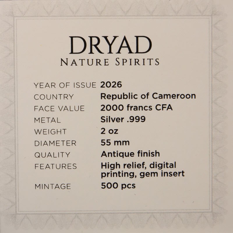 Серебряная монета Камеруна "Духи природы. Дриада" 2026 г.в., 62.2 г чистого серебра (проба 999)