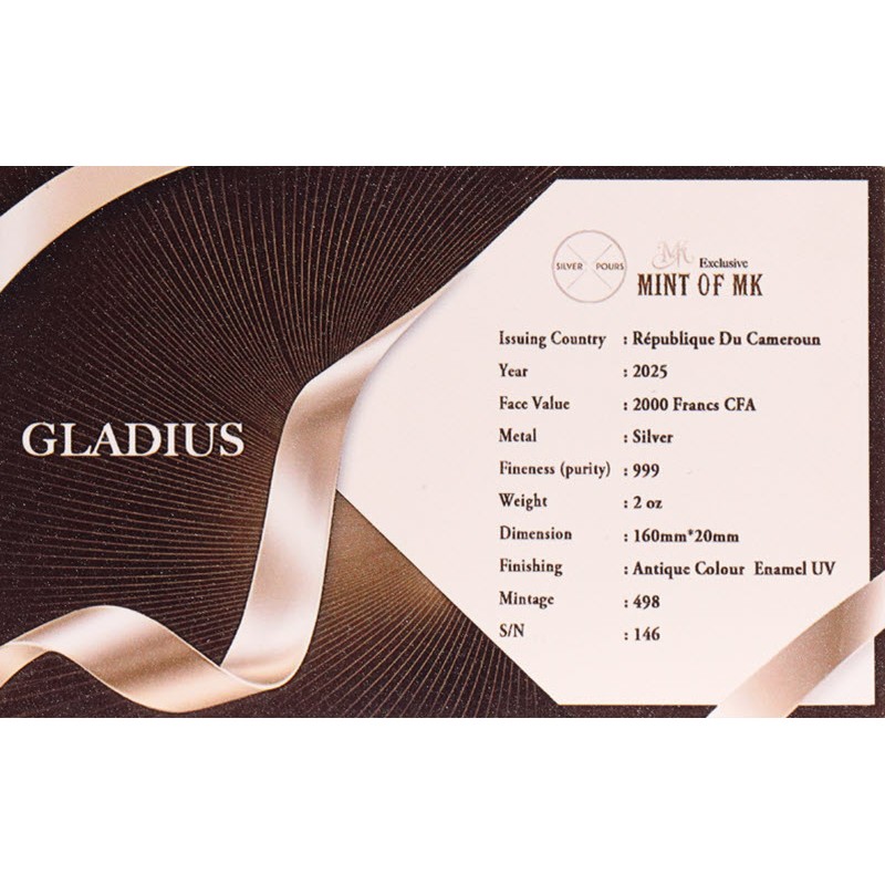 На аверсе в основании лезвия изображен герб Камеруна. Вокруг герба надпись: REPUBLIQUE DU CAMEROUN 2 oz Ag 999 2000 FRANCS CFA 2025 (страна-эмитент, вес и проба серебра, номинал, год чеканки). Слева вдоль кромки: Gladius Sword of Gladiator (Гладиус – меч Гладиаторов).