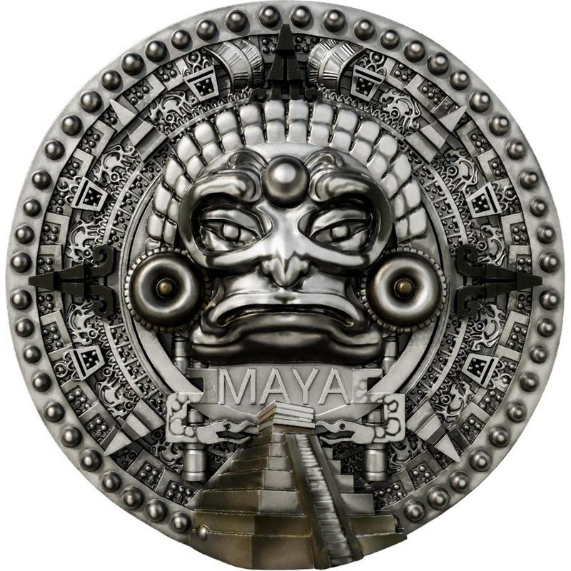 На реверсе изображена маска майи на фоне глифов и пирамиды. Внизу маски надпись: MAYA.