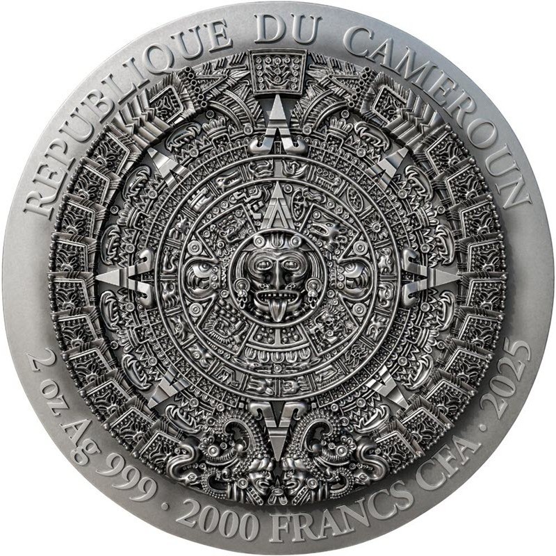 На аверсе в центре изображено солнечное божество Тонатиу с высунутым языком, жаждущее жертв. Фоном служит календарь майя. Вдоль канта надпись: REPUBLIQUE DU CAMEROUN 2 oz Ag 999 · 2000 FRANCS CFA · 2025 (страна-эмитент, вес и проба серебра, номинал, год чеканки).