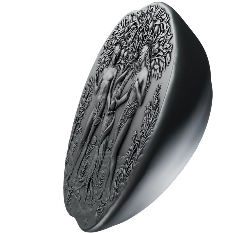 Эта удивительная серебряная монета весом в 260 грамм от Литовского монетного двора в форме яблока посвящена грехопадению Адама и Евы. Дизайн Мирослава Хрича (Miroslav Hric). У нее размер 40.4 Х 48.2 Х 20.2 мм, качество античной отделки и высокий рельеф. Поставляется в оригинальном футляре с сертификатом подлинности. Тираж: 100 штук.