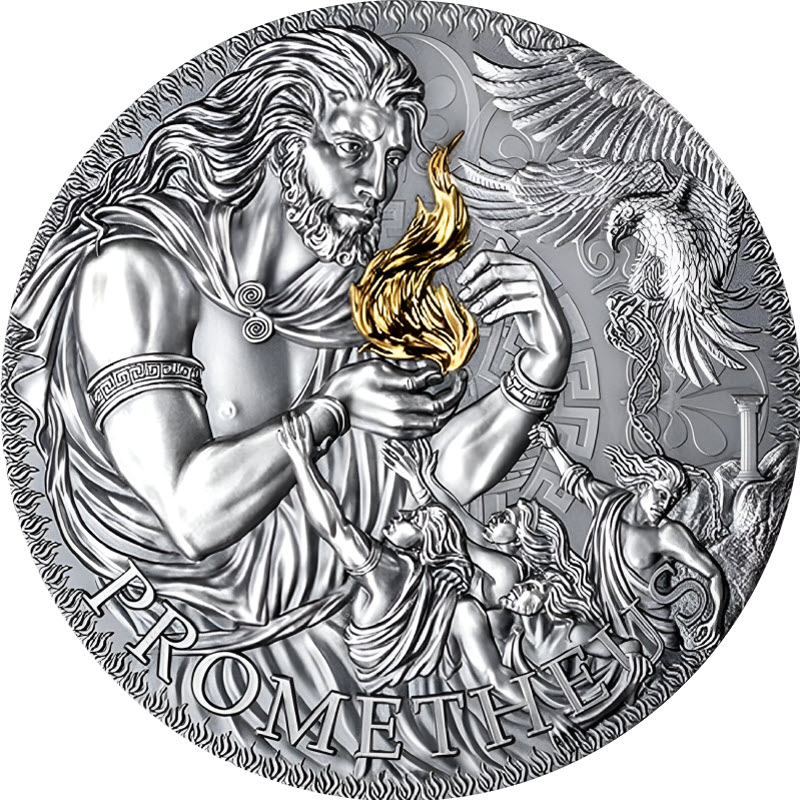 На реверсе изображен бог огня-титан Прометей. Он предстает с позолоченным огнем, к которому люди тянутся снизу за помощью в горельефе. Прометей бросил вызов древним богам, похитив огонь и подарив его человечеству. Ему поклонялись за то, что он создал смертных и дал им необходимый дар для выживания. За свои действия Титан нес вечные муки, приговоренный Зевсом. Он пережил 30 000 лет агонии. Каждый день в цепях на краю горы ждет, пока орел нападет на него и возрождается позже, чтобы все муки повторить на следующий день. Название монеты — «PROMETHEUS».