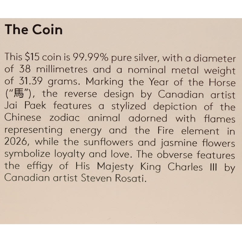 На реверсе изображена лошадь в народном стиле. Слева китайский иероглиф: ⾺ (Год Лошади), справа внизу: JP (инициалы дизайнера Jai Paek). Вдоль канта надпись: Canada 2026 15 DOLLARS (страна-эмитент, год чеканки, номинал).