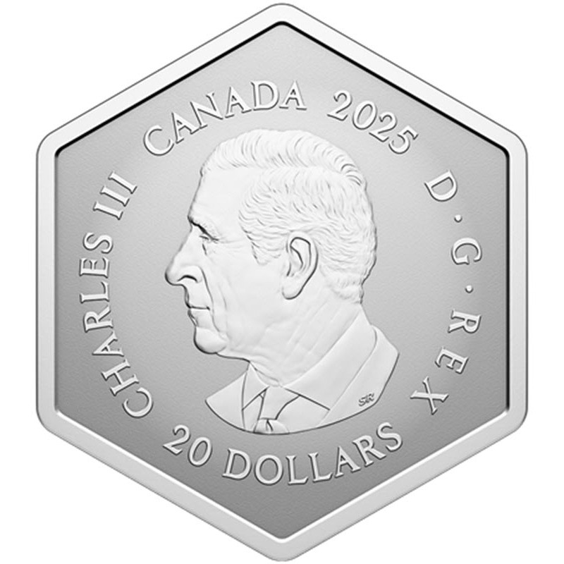 На аверсе изображен Его величество Король Чарльз III. На воротнике инициалы дизайнера SR (Steven Rosati). Вдоль канта надпись: CHARLES III CANADA 2025 D·G·REX 20 DOLLARS (Чарльз III, страна-эмитент, год чеканки, милостью Божией, король, номинал).