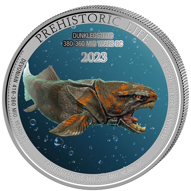 На реверсе красочное изображение панцирной рыбы дунклеостея. Она изображена плывущей в воде с широко раскрытой пастью на фоне пузырьков воздуха. Над головой дунклеостея надпись в три строки: DUNKLEOSTEUS 380 - 360 MIO YEARS BC 2023. Вдоль канта надпись: PREHISTORIC LIFE DEVONIAN 416-360 MIO. YEARS BC CARBONIFEROUS 360-298 MIO. YEARS BC PERMIAN 298-250 MIO. YEARS BC (доисторическая жизнь; девонский, угольный и пермский периоды).