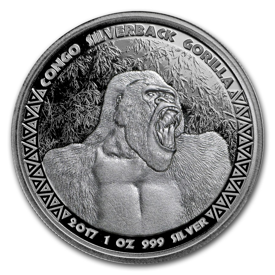 Фигура гориллы в центре, по ободу — название монеты, год выпуска, вес и чистота металла