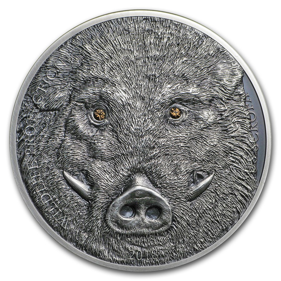 На девятой серебряной монете отмеченной наградами серии «Защита дикой природы» изображен дикий кабан. Эта серебряная монета украшена кристаллами Swarovski и имеет красивую античную отделку. Монета упакована в деревянный футляр с сертификатом подлинности. Тираж 2500 монет.
