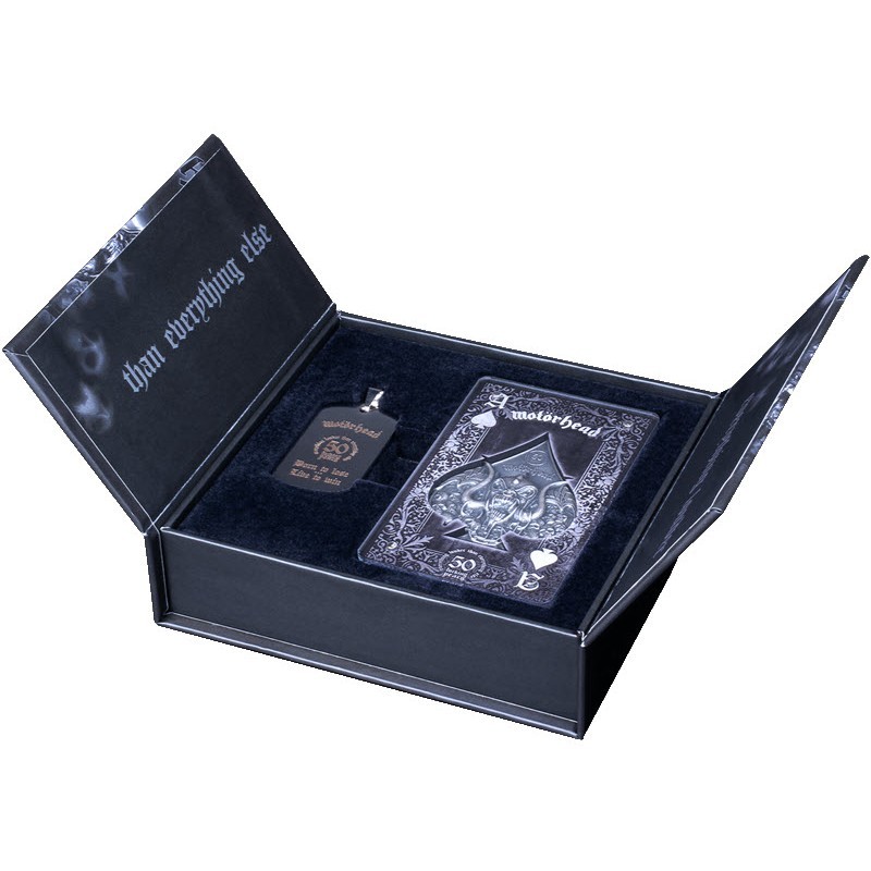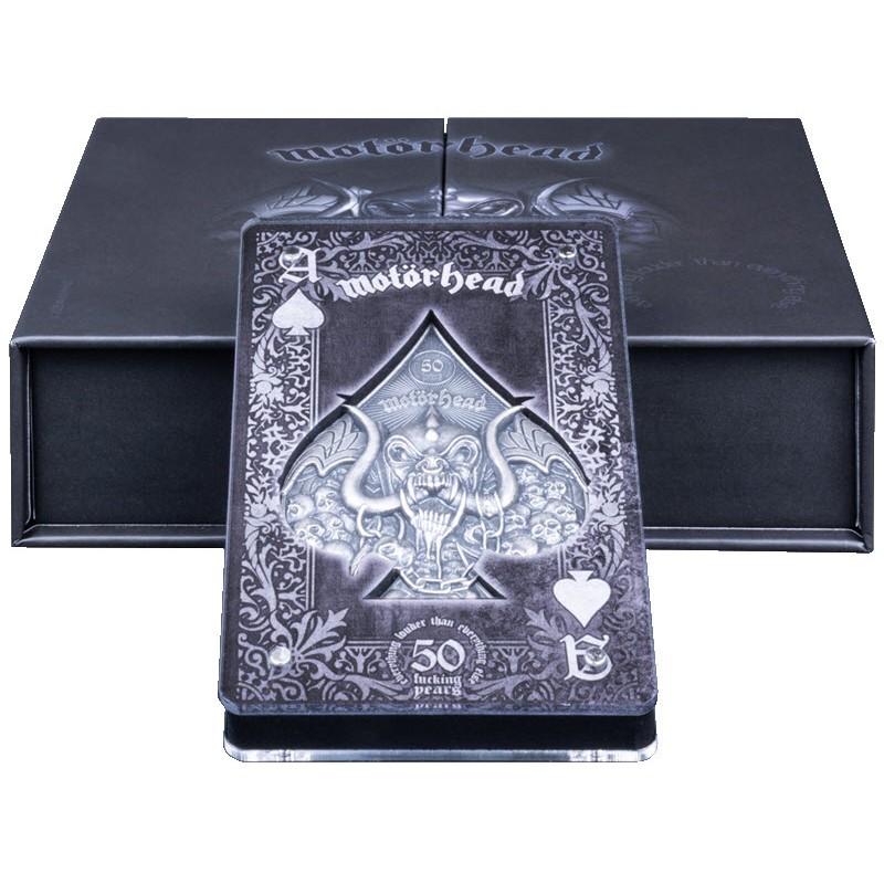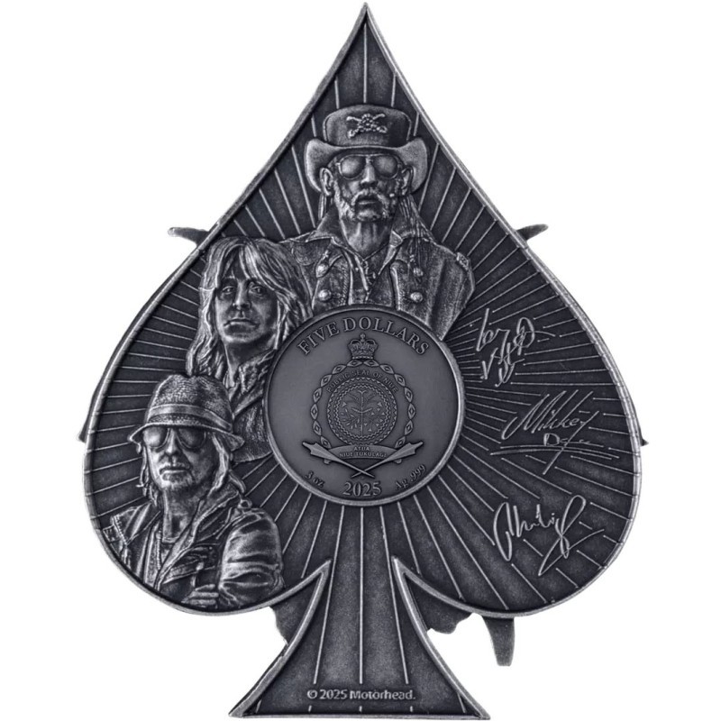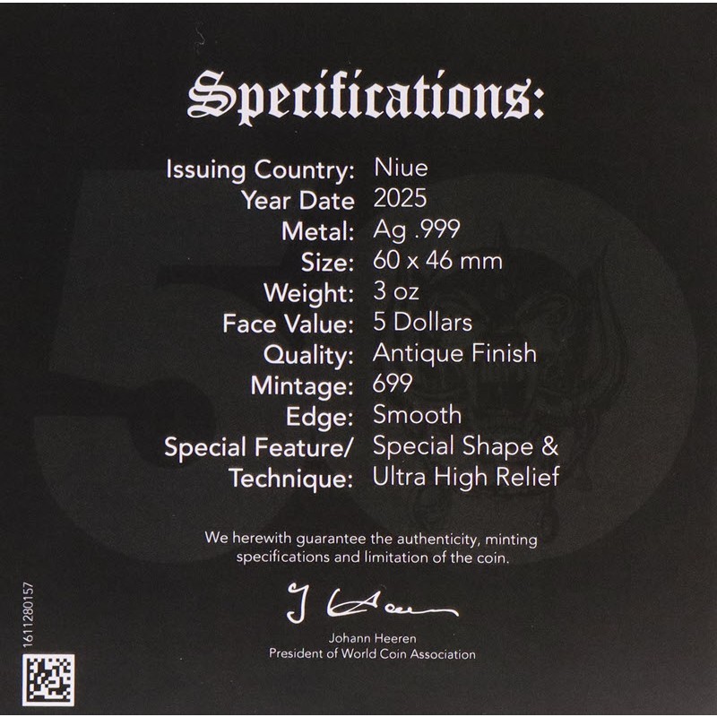 Эта чудесная серебряная монета весом в 3 унции от немецкого монетного двора MDM посвящена 50-летию группы «Моторхед».  У нее форма пиковой масти размером 60 х 46 мм, качество античной отделки и ультра высокий рельеф. В комплект входит брелок, посвященный группе. Поставляется в оригинальном футляре с сертификатом подлинности. Тираж: 699 штук.