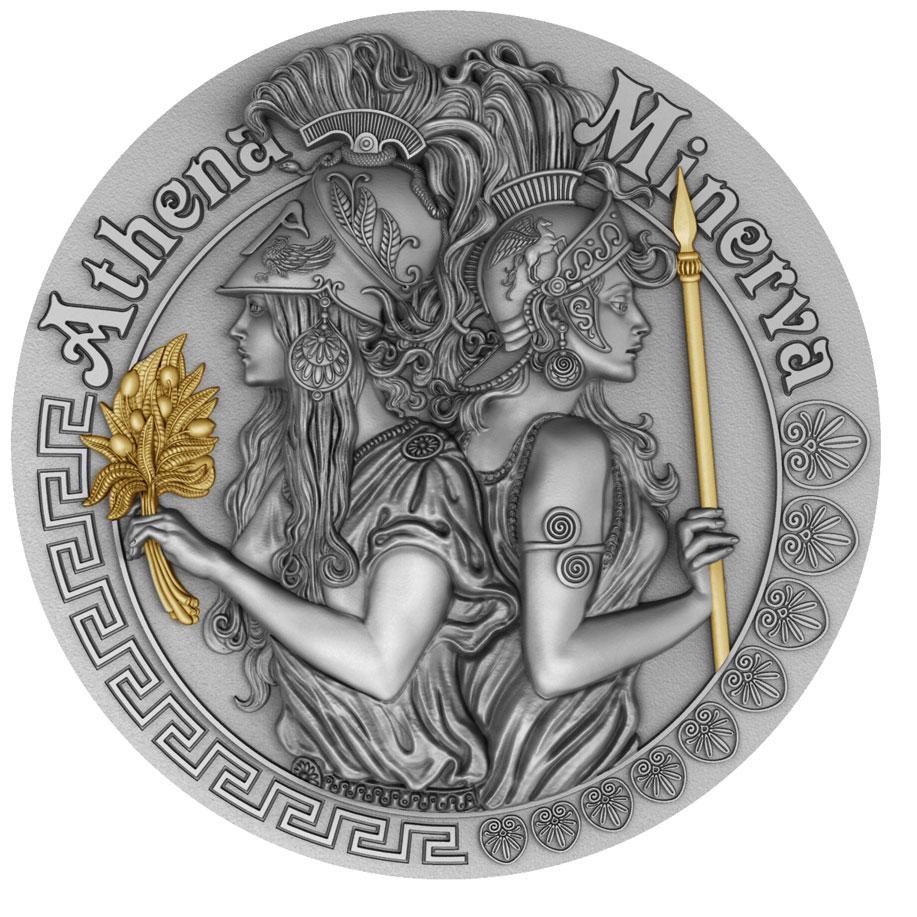 На реверсе монеты изображен рельефный образ богинь Афины и Минервы с красивыми селективными позолочениями. Сверху на обороте надпись: «Афина и Минерва» - название монеты.