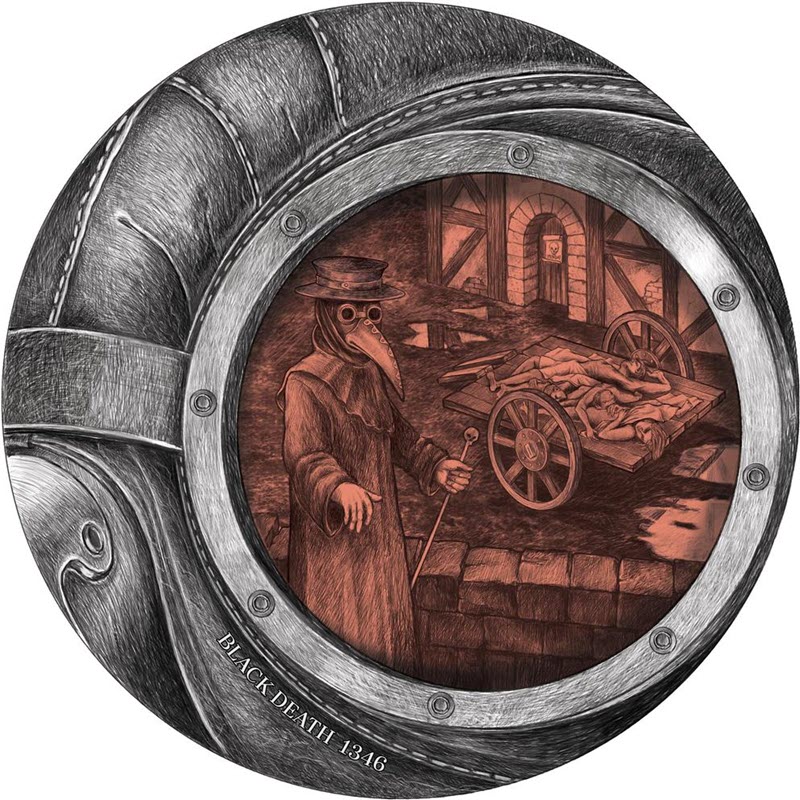 На реверсе монеты изображен фрагмент характерной маски, которую носили врачи, лечившие больных чумой. В линзе характерная сцена чумы - деревянная телега с безжизненными людьми. Внизу надпись: BLACK DEATH 1346.