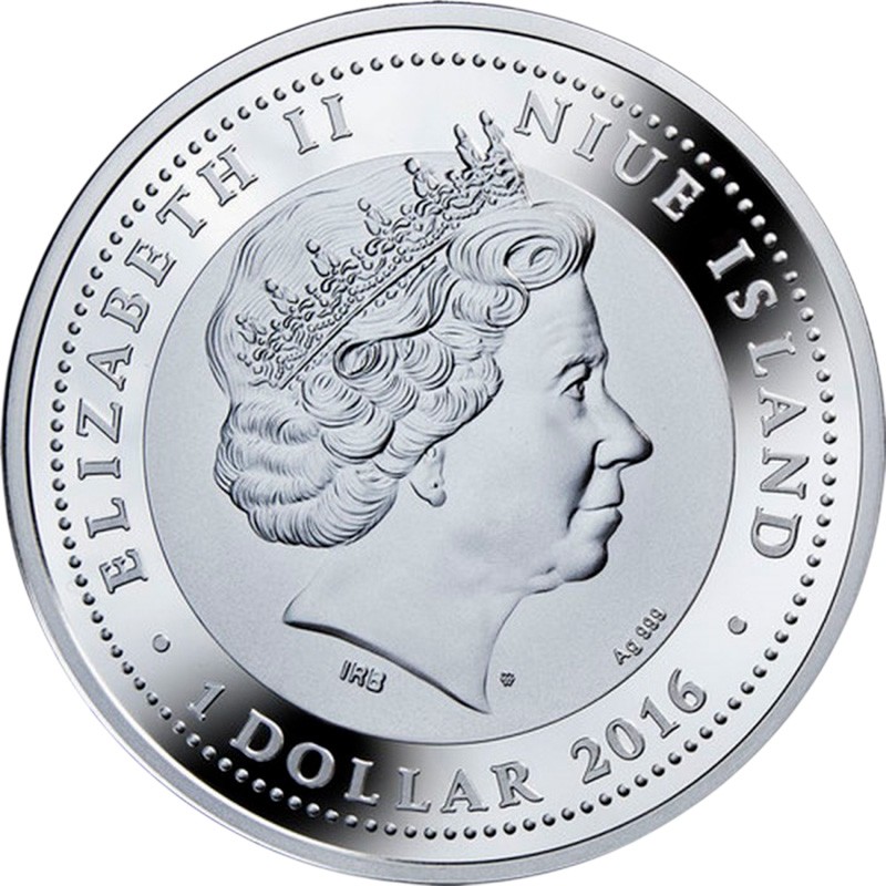 В центре монеты – портрет королевы Елизаветы II, работы дизайнера Яна Рэнка-Бродли (IRB). Под портретом надписи: Ag 999 (проба серебра) и буквы m/w (монограмма Польского монетного двора). Вдоль канта надписи: 1 DOLLAR 2016 ELIZABETH II NIUE ISLAND (номинал, год чеканки, Елизавета II, страна-эмитент).